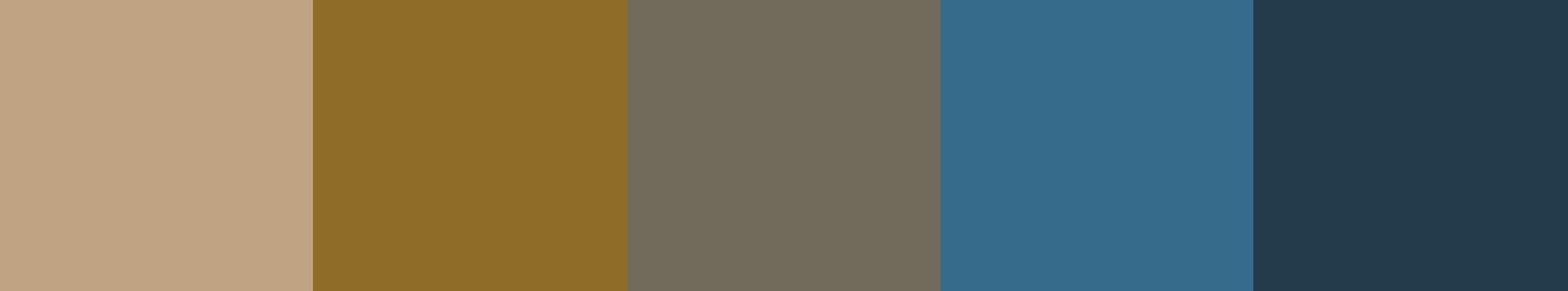 #bfa382 | #8f6c27 | #726b5c | #376b8b | #233b4a |